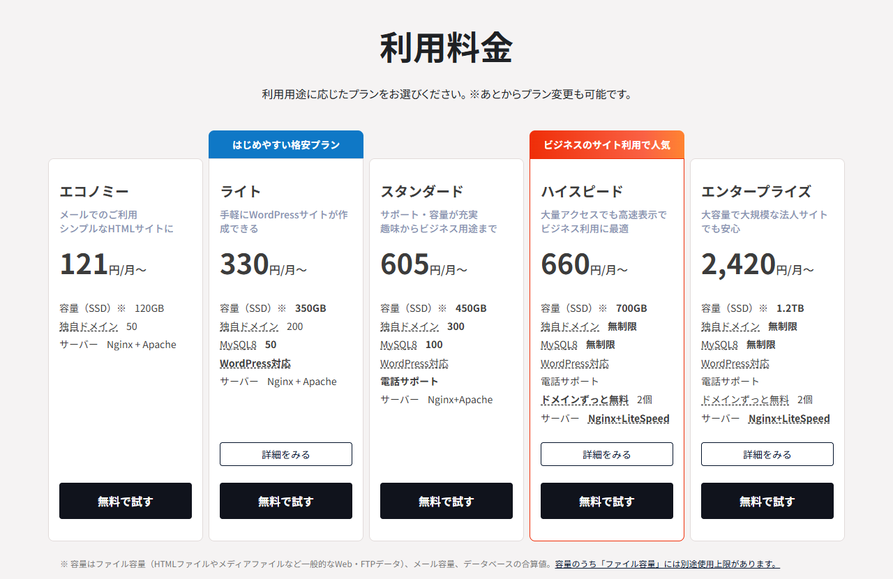 短期契約だと割高になるため、数ヶ月だけ試したいという用途には不向きです。大規模な法人サイトを運用するなら、エックスサーバーやAWSなどのクラウドサービスも検討してみてください。