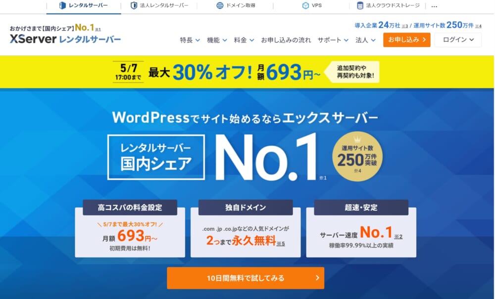 エックスサーバーは、国内シェアトップクラスの大手レンタルサーバー。WordPressの表示速度・サポート品質で高い評価を得ています。