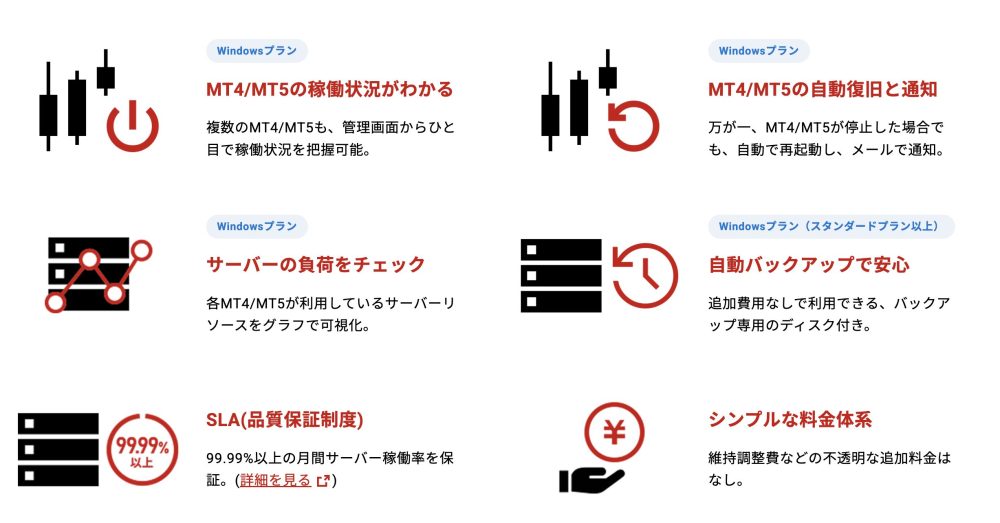 3つ目はSLA(品質保証制度)です。99.99%以上の月間サーバー稼働率を保証しており、万が一この基準を下回った場合は月額利用料金の一部が返金されます。この稼働率は年間換算で約53分以内のダウンタイムに相当し、FX取引に求められる高い安定性を担保しています。