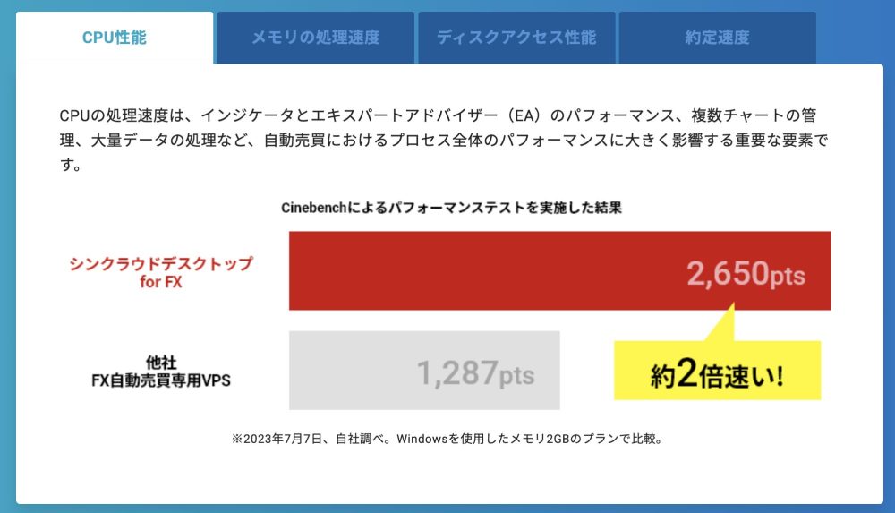 公式サイトでは、他社FX自動売買専用VPSとの性能比較データが公開されています。メモリ2GBのWindowsプランで比較した場合、CPU性能は約2倍、メモリ処理速度は読み書きともに約2倍、ディスクアクセス性能は読み込み約34倍・書き込み約30倍という結果が示されています。