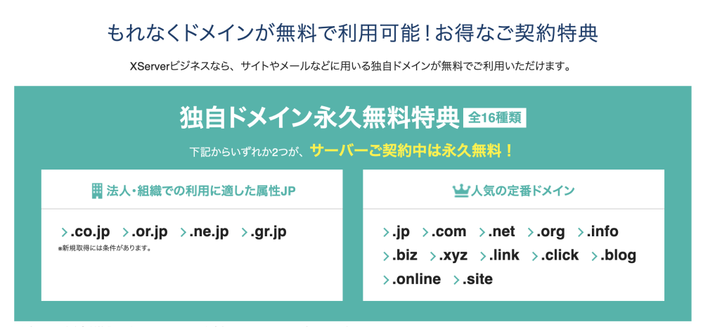 XServerビジネスでは、法人専用の「.co.jp」ドメインを含む16種類から2つのドメインを永久無料で取得できます。.co.jpドメインは日本国内に登記のある企業のみが取得できるため、取引先や顧客に対して信頼性をアピールできます。